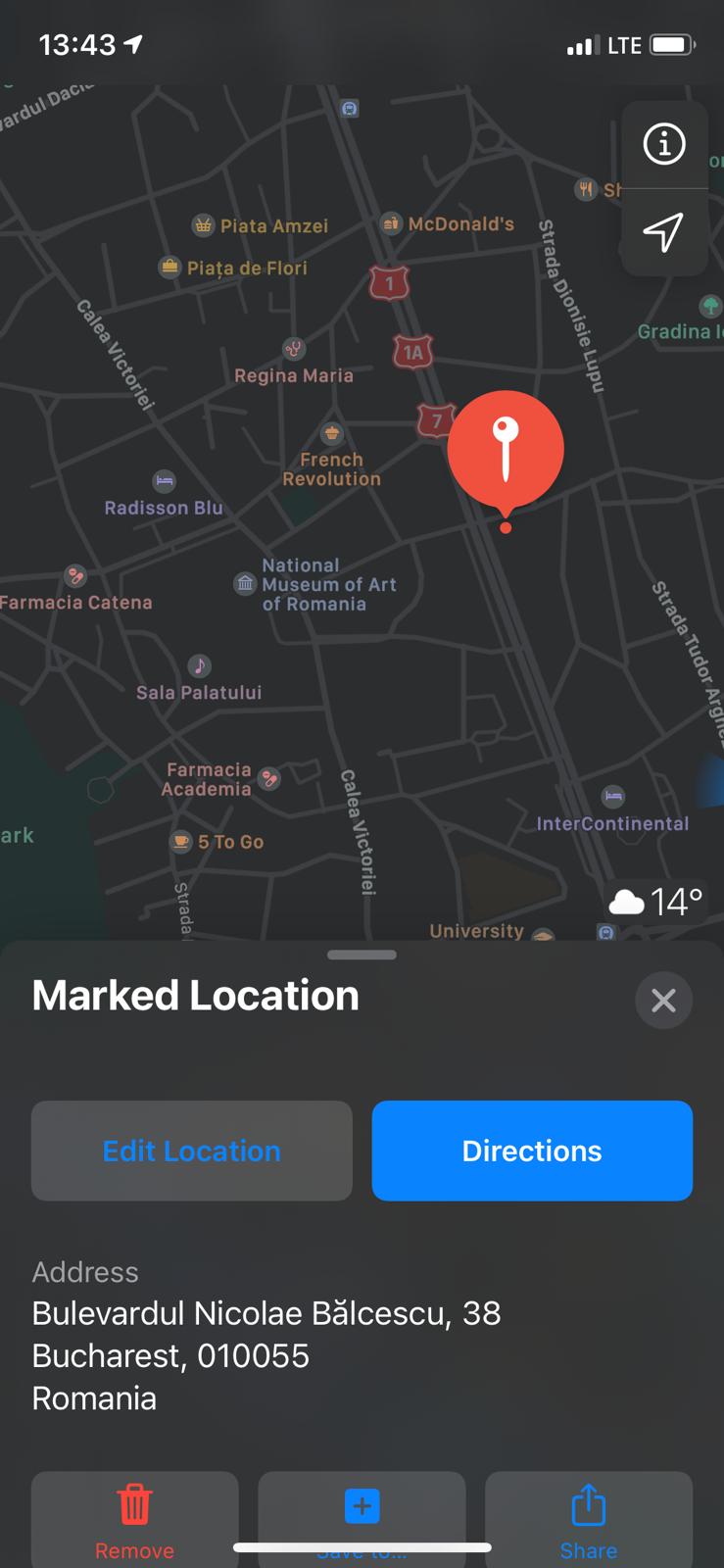 Și Apple Maps, la fel ca și celelalte două aplicații de hărți, permite marcarea locației cu un pin, funcție care îți poate fi de mare ajutor, mai ales atunci când ți-ai propus să te întâlnești cu un prieten și preferi să îi dai share locației, decât să îi explici în modul clasic cum ar putea ajunge la destinația aleasă.