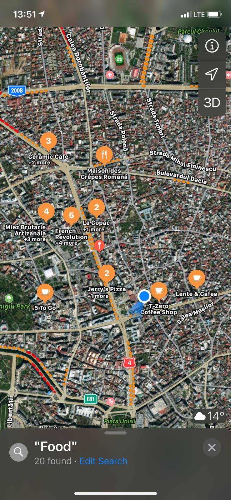 La fel ca Google Maps, Apple Maps îți va afișa și numele anumitor companii pe hartă, ceea ce e posibil să-ți fie de mare ajutor, pentru a te orienta mai bine în spațiu. Dacă te descurci mai bine cu varianta de satelit a hărții, tot în acest punct poți alege să vizualizezi locația de sus, eventual în varianta 3D.