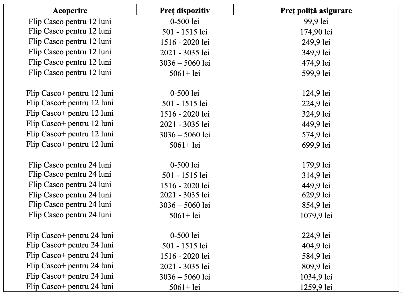 În tabelul de mai jos regăsești prețul pentru cele două tipuri de asigurări, Flip CASCO si Flip CASCO +, pe perioada de 12 sau 24 de luni.