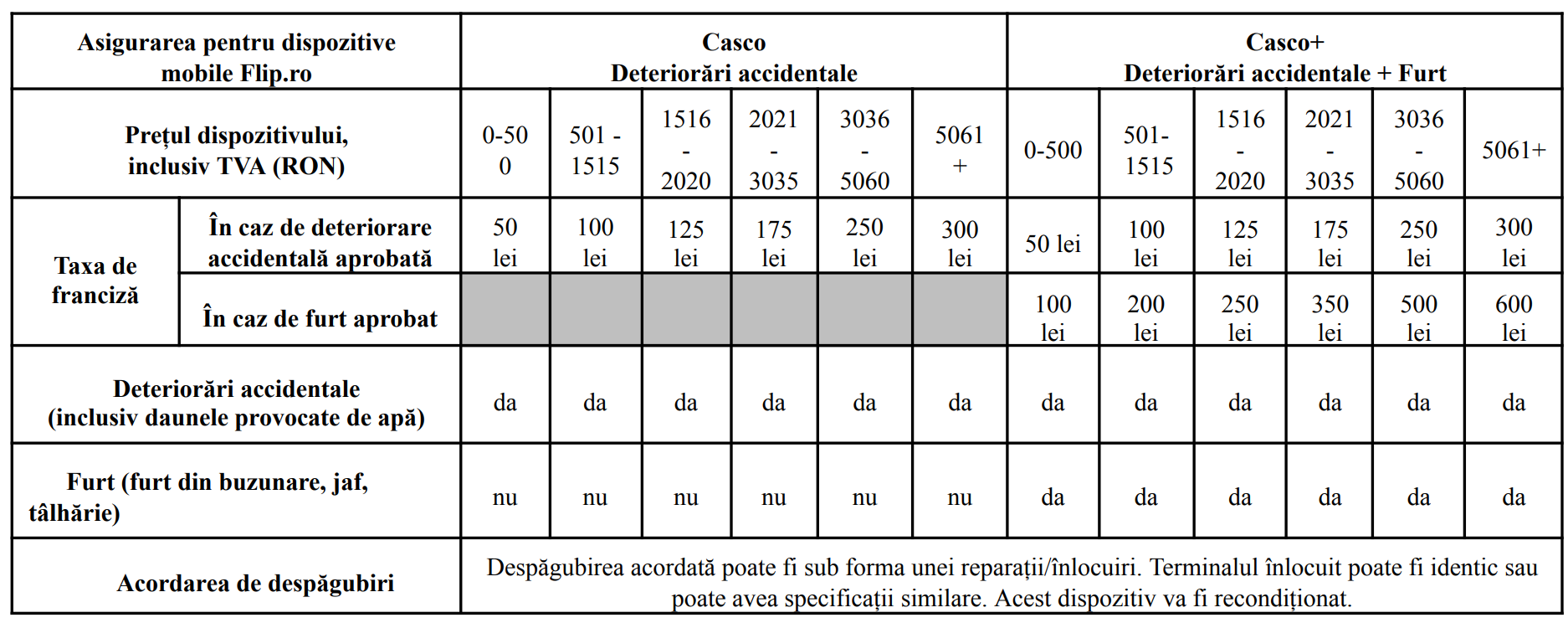 • Se va achita o taxă de franciză pentru fiecare cerere aprobată. Această sumă variază în funcție de tipul de asigurare ales și se achită înainte de a finaliza cererea de asigurare. Suma exactă a acestei francize este specificată în tabelul de mai jos și va fi menționată în mod specific în certificatul de asigurare pentru tipul de asigurare și dispozitiv pe care l-ați ales.