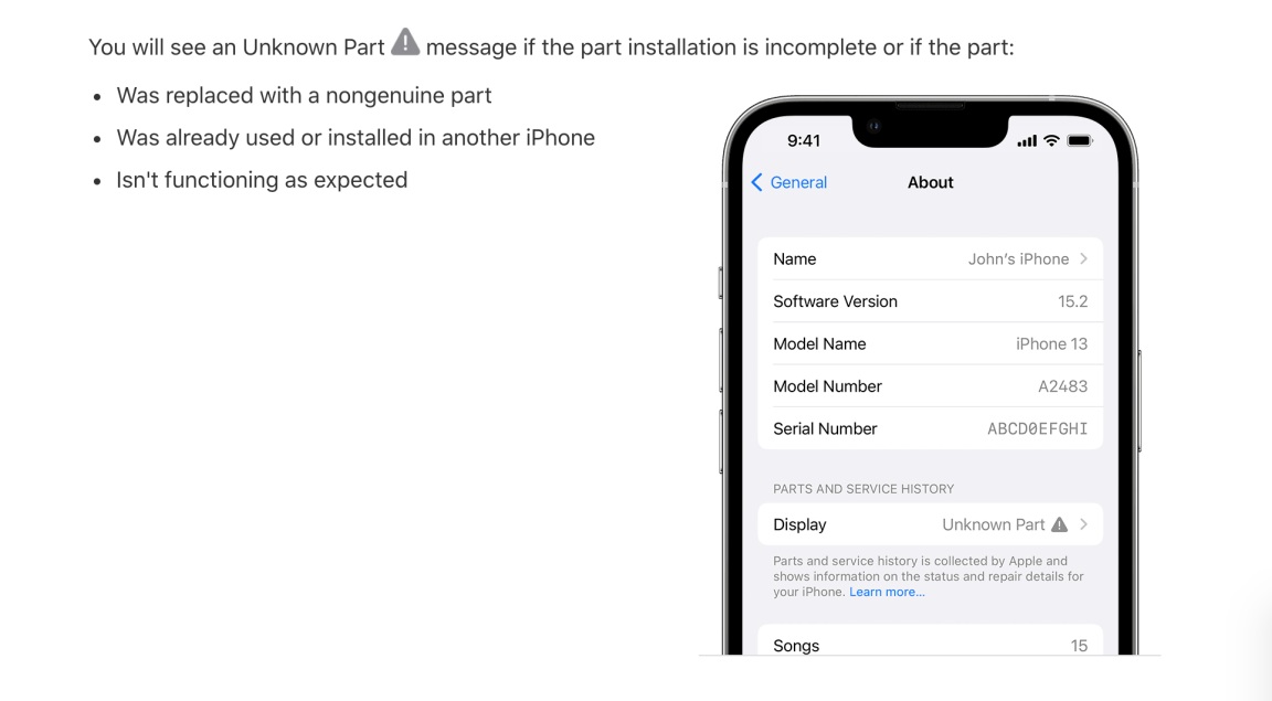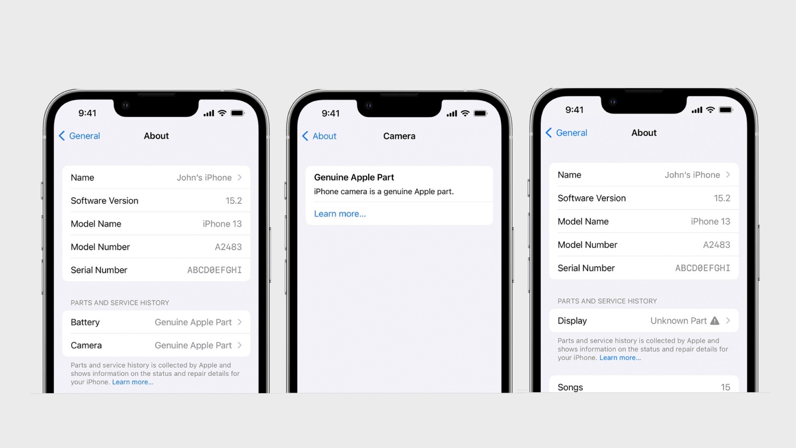 În cazul modelelor de iPhone XS, iPhone XR și iPhone SE (2020), funcția nouă, Parts and Service History, va afișa doar informații legate de baterie. În schimb, modelele de iPhone 11, iPhone 12 și iPhone 13 vor cuprinde în aceeași secțiune din meniu și informații despre ecranul telefonului, în vreme de variantele de iPhone 12 și iPhone 13 vor avea și informații legate de istoricul de reparații ale camerelor foto.
