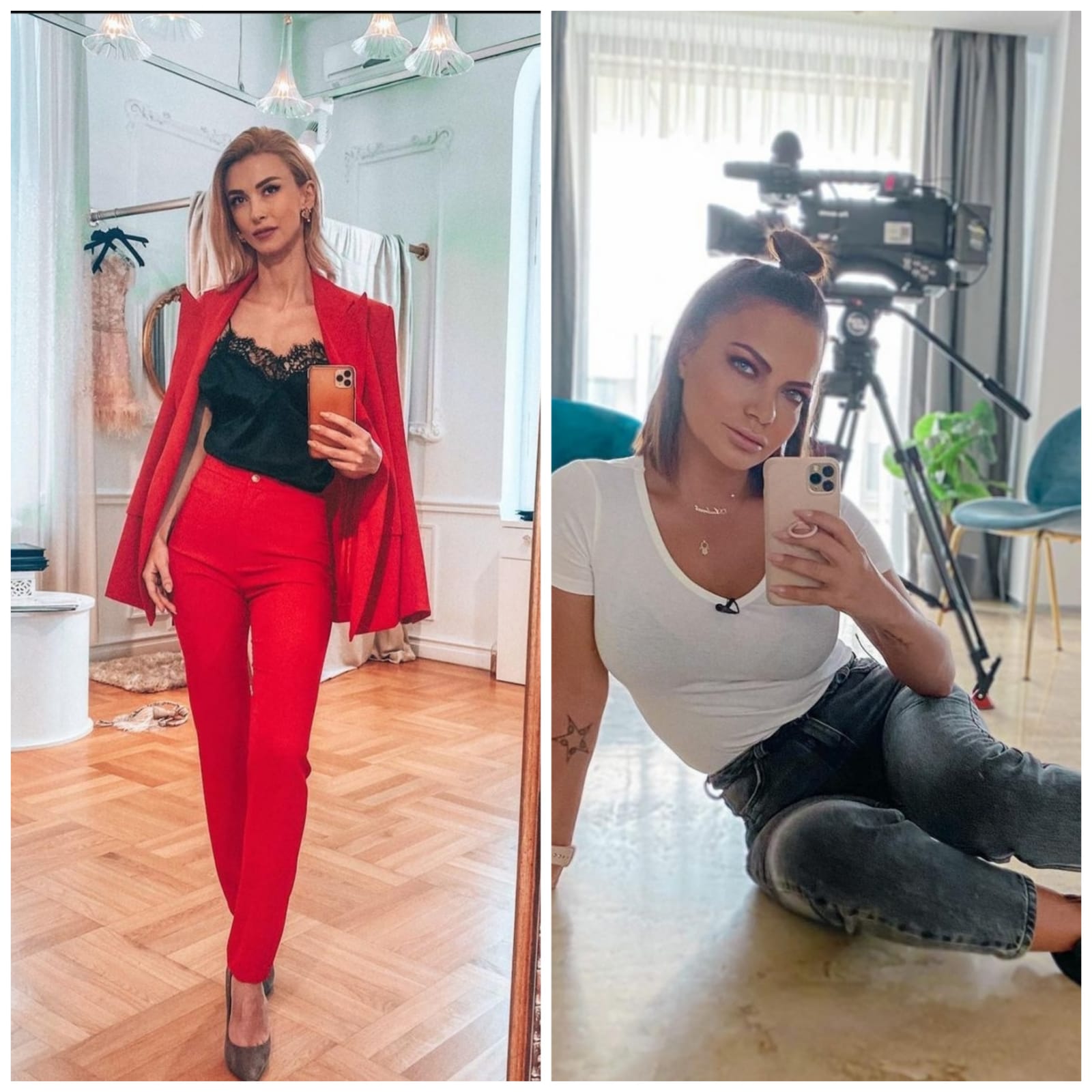 Dacă tot s-au reunit nu demult, ne-am permis să le punem împreună pe fetele de la André, mai ales că folosesc același model de telefon. Andreea Bălan și Andreea Antonescu au câte un iPhone 11 Pro Max cu care și-au făcut de curând selfie-uri în oglindă.