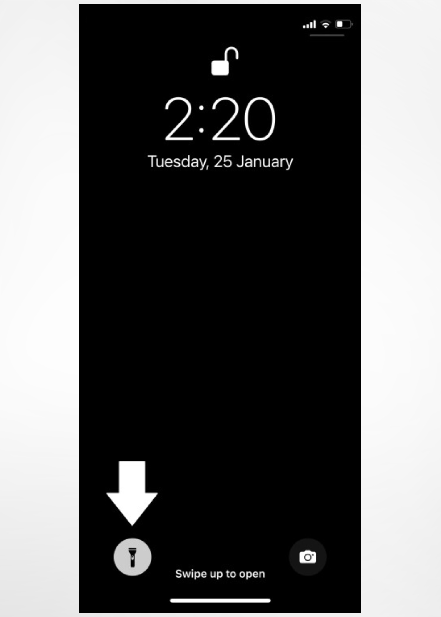 Imediat ce iei telefonul în mână, fără să-l deblochezi, vei observa că poți activa lanterna ținând apăsat lung butonul din stânga, jos. Când auzi un „click”, poți lua degetul de pe buton și poți folosi lanterna.