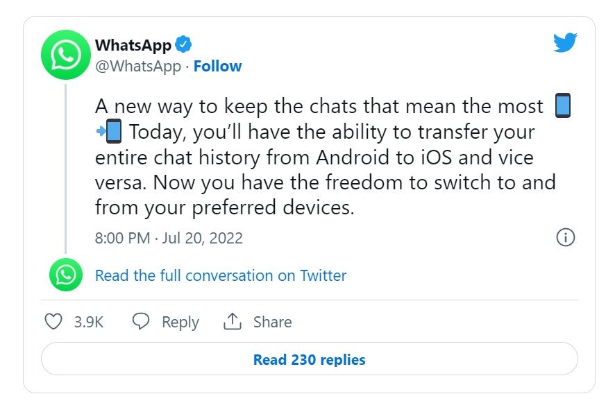 Anunțat încă de anul trecut, transferul istoricului de conversații de pe WhatsApp între iOS și Android este, în sfârșit, disponibil pe toate telefoanele, în mod oficial. Până nu demult, acest transfer nu era imposibil de făcut, însă presupunea utilizarea unei aplicații terțe, eventual a uneia cu plată.